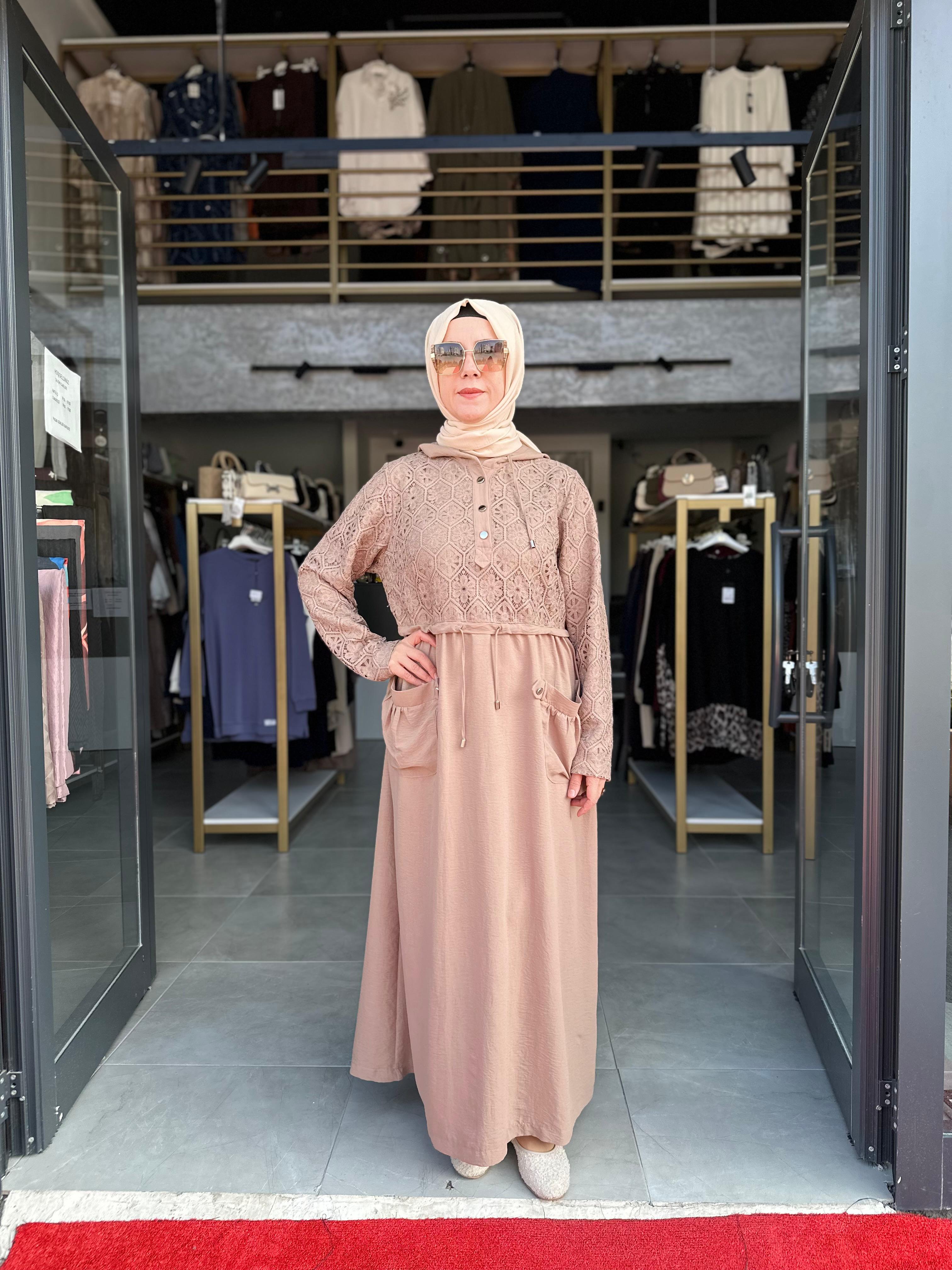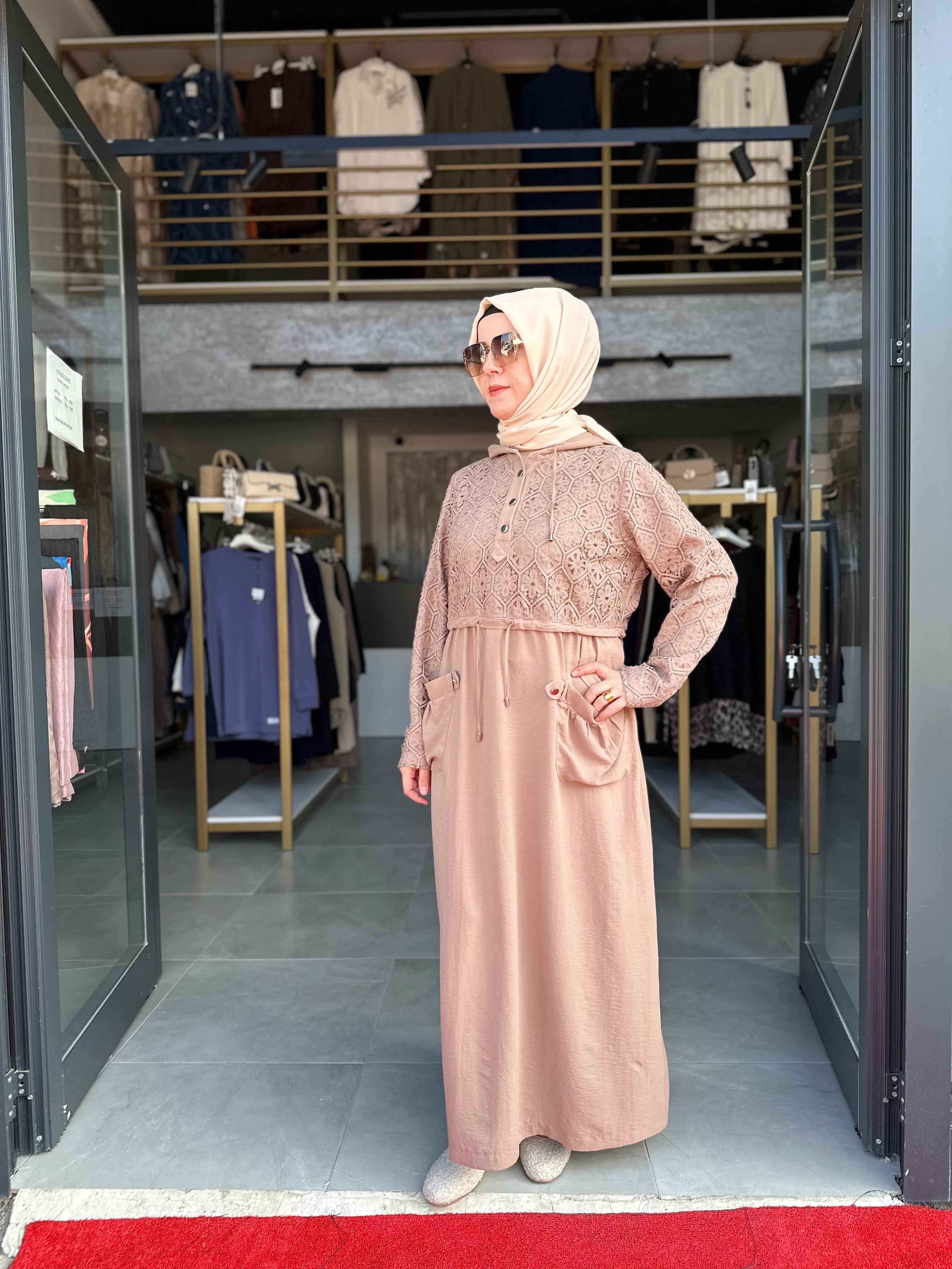 DANTEL İŞLEMELİ VİZON ELBİSE